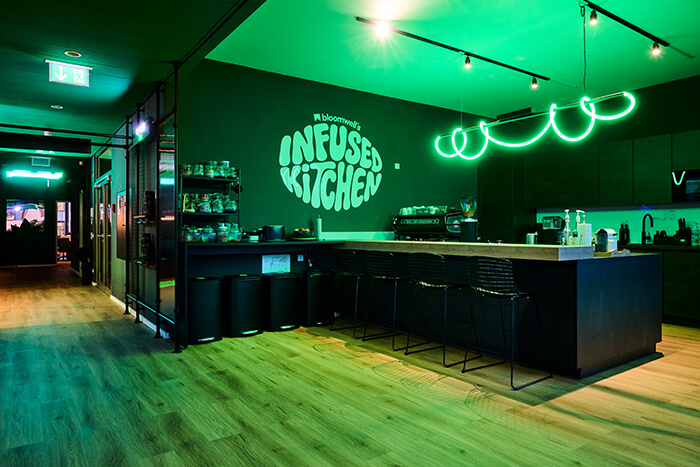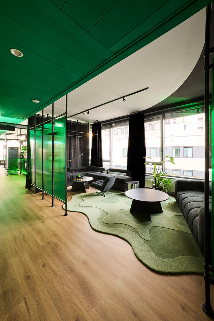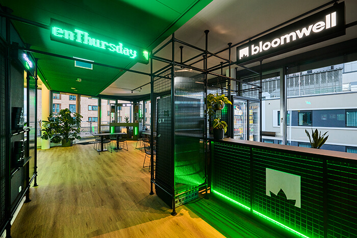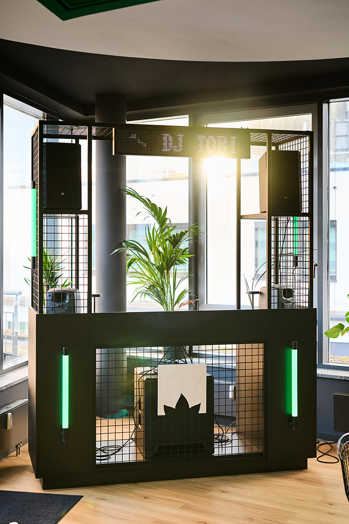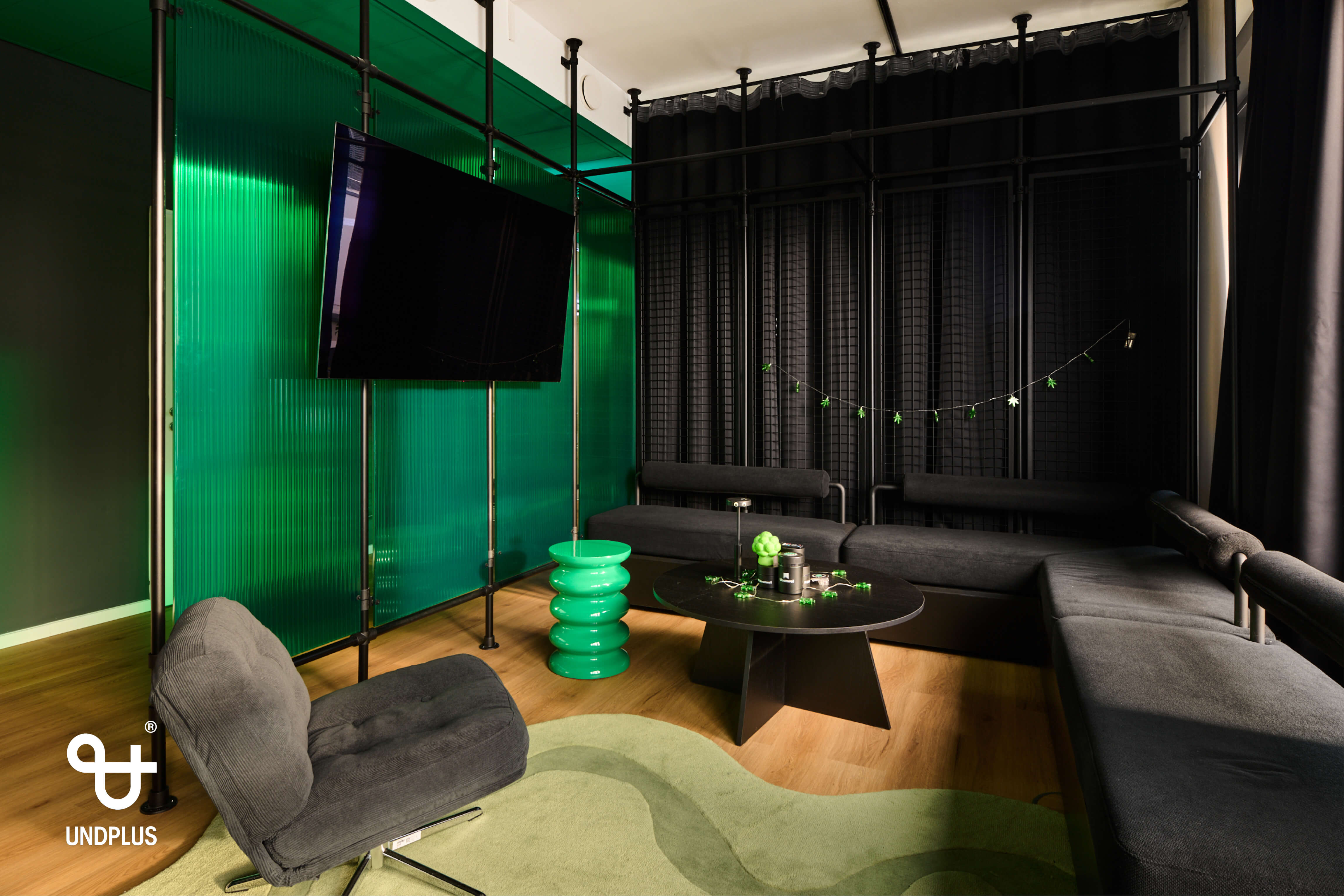 Der Eingangsbereich eröffnet mit einer raumgreifenden Installation einen ersten Einblick in die Markenwelt von Bloomwellhttps://bloomwell.de/ und die Gestaltungssprache von UNDPLUS. Dieser führ zu einem beleuchteten Tresen, der zugleich Empfang und Bar bildet. Durch zwei angrenzende Raumtrenner, entwickeln sich eine Social Area mit maßgefertigten Sitzbänken, Tischen und DJ-Booth für Pausen, DJ-Sets und Events sowie ein Lounge-Bereich für Casual Meetings, Livestreams und Gaming.