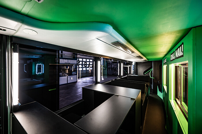 Im Obergeschoss entstand eine exklusive Lounge mit individuell gefertigten Möbeln, die flexibel zur Party Area mit DJ umfunktioniert werden kann. Ergänzt wird das Setting durch ein separates Podcast-Studio, das Content-Produktion direkt vor Ort ermöglicht.