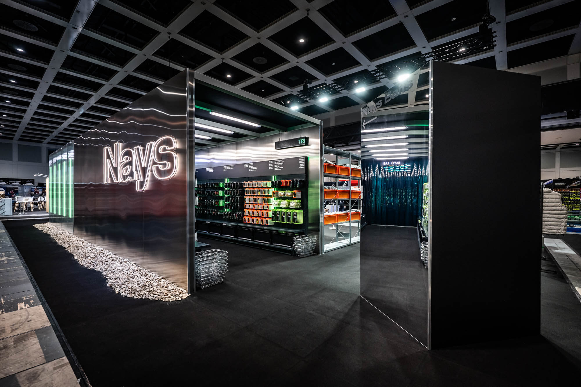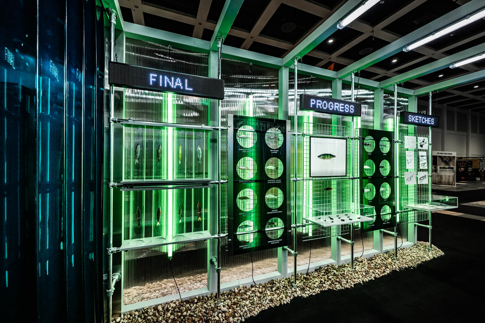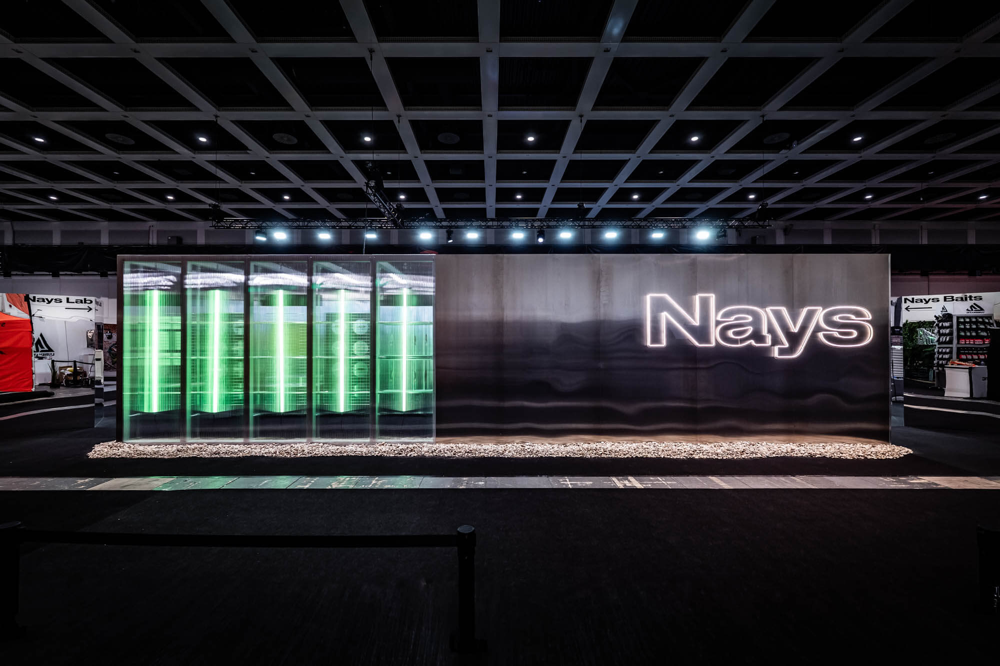 Herzstück des 200 m² großen Standes war ein 12×3 Meter begehbarer Metallkörper, das NAYS-LAB. In diesem wurde die Köderproduktion als sichtbarer Work-in-Progress inszeniert: von der ersten Skizze über Prototypen bis hin zum fertigen Produkt. Der Entwicklungsprozess wurde Teil des Raumerlebnisses – transparent, nachvollziehbar, authentisch.