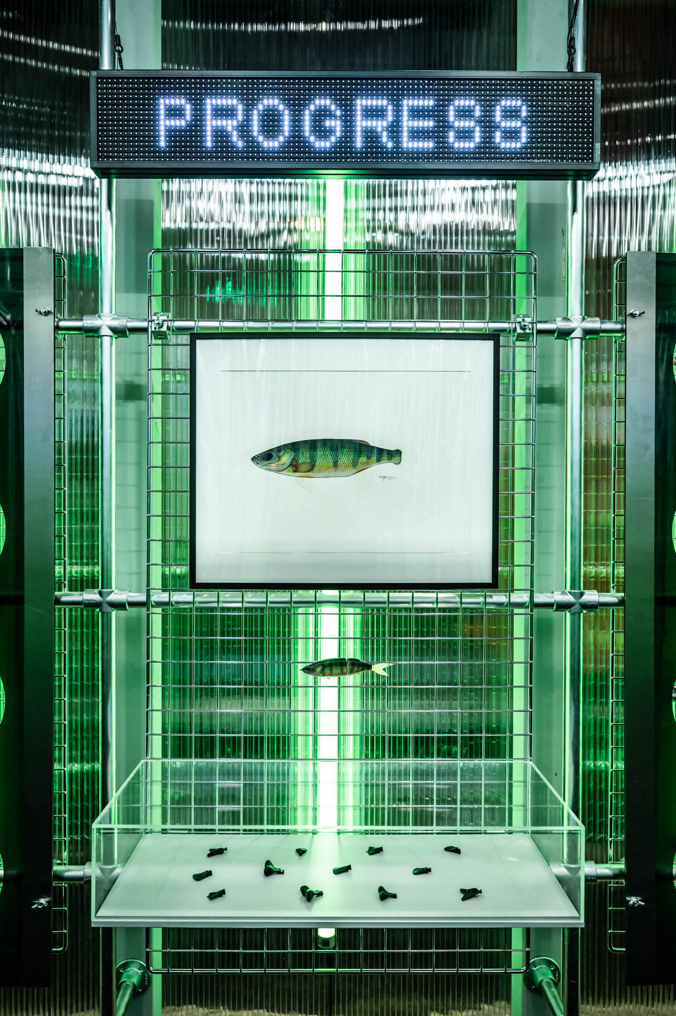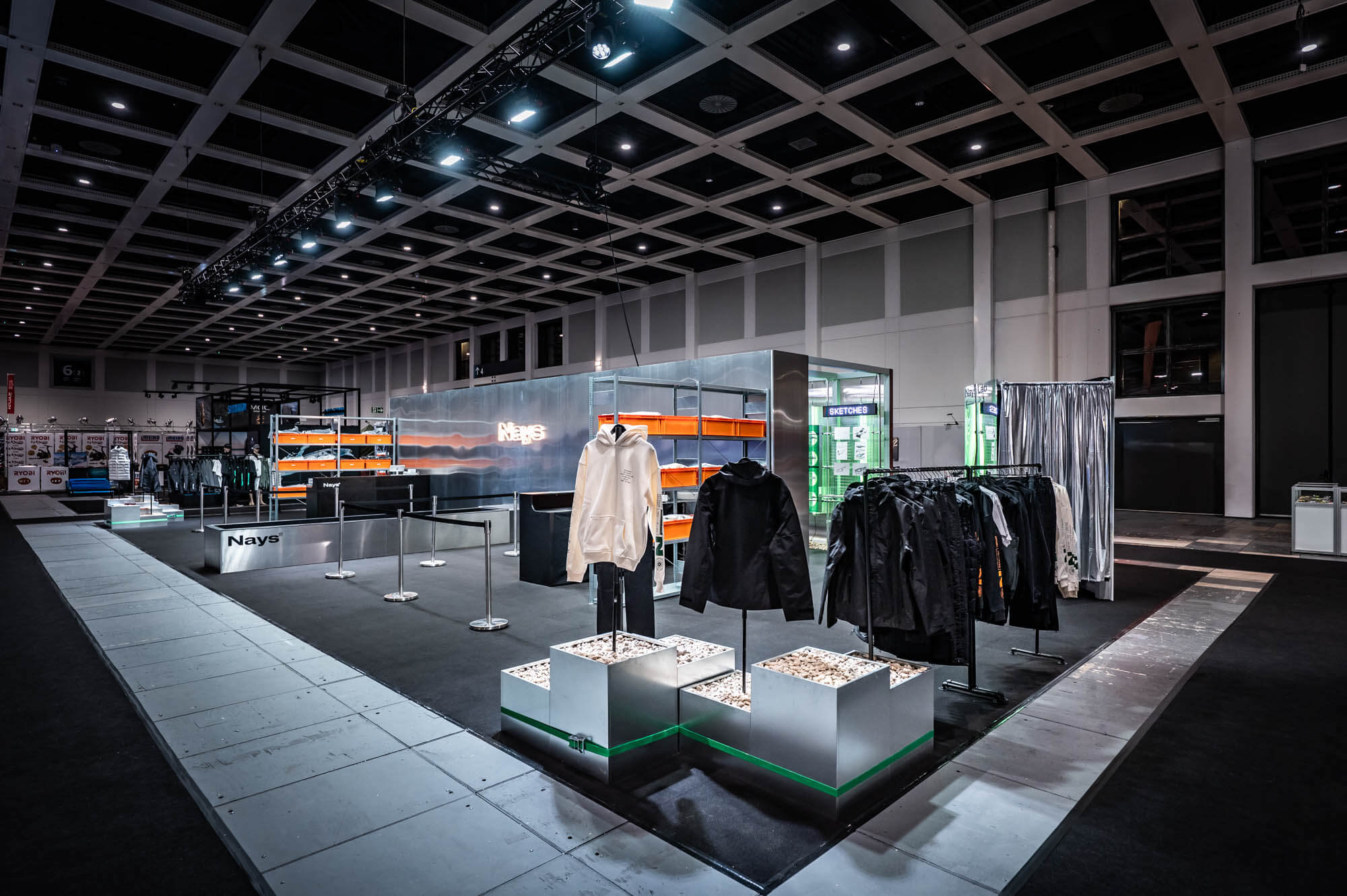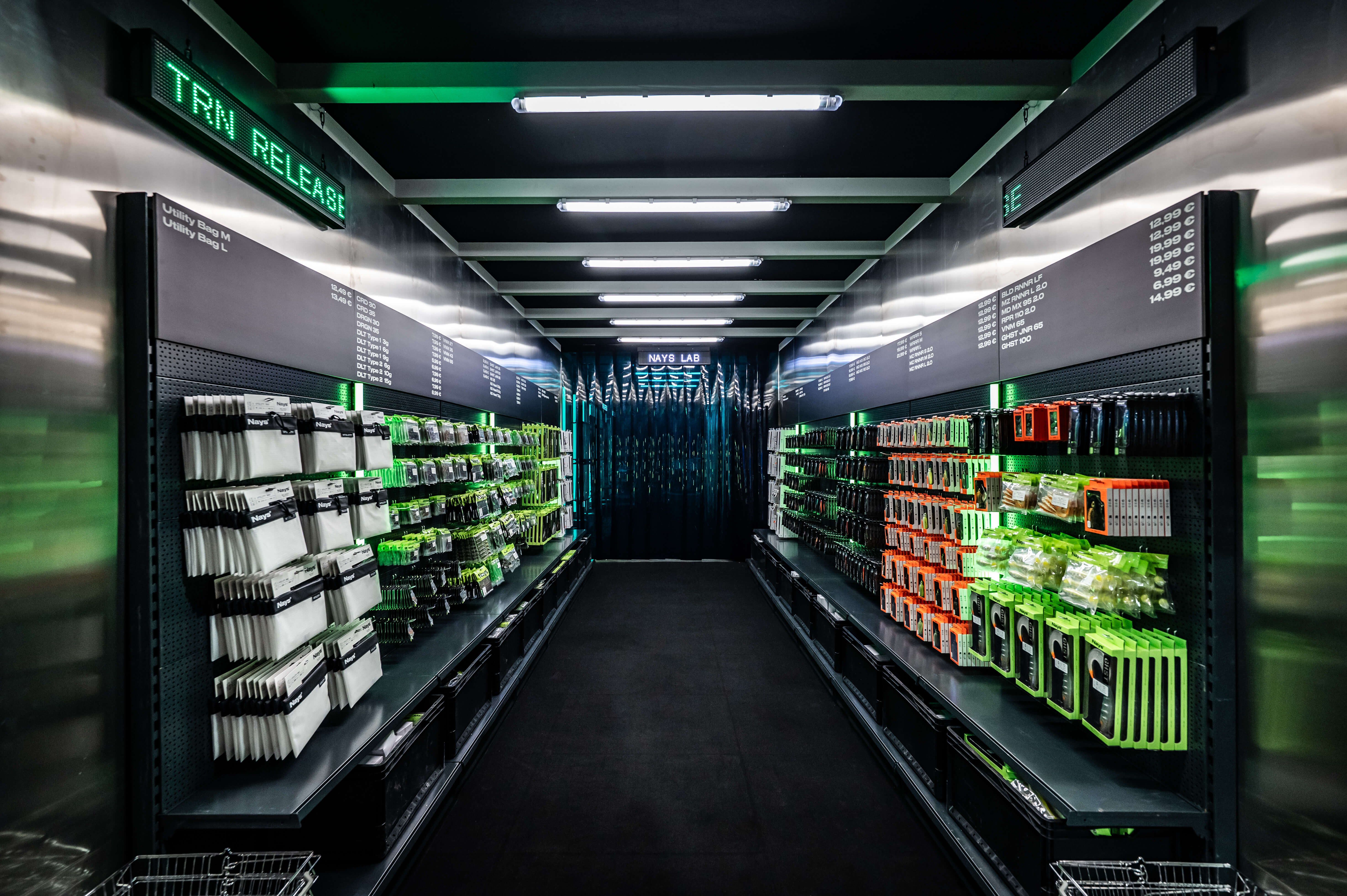 Herzstück des 200 m² großen Standes war ein 12×3 Meter begehbarer Metallkörper, das NAYS-LAB. In diesem wurde die Köderproduktion als sichtbarer Work-in-Progress inszeniert: von der ersten Skizze über Prototypen bis hin zum fertigen Produkt. Der Entwicklungsprozess wurde Teil des Raumerlebnisses – transparent, nachvollziehbar, authentisch.